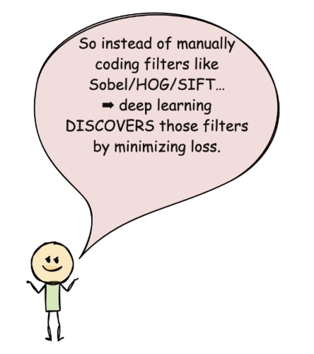 Earlier computer vision relied on manual features, designed by humans and based on domain knowledge