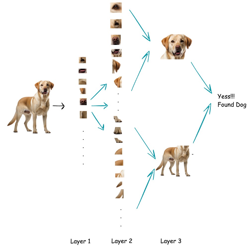 When we look at a dog, your brain does parallel processing of colors, shapes, edges, textures, motion etc. Our brain has prior knowledge from years of experience, so it knows that dogs have ears, fur, legs, tails and cars have wheels, headlights, windows. So when you see something with four legs + fur + tail and a specific shape, out brain immediatelly decides that it is a dog (even if itβs partially hidden).