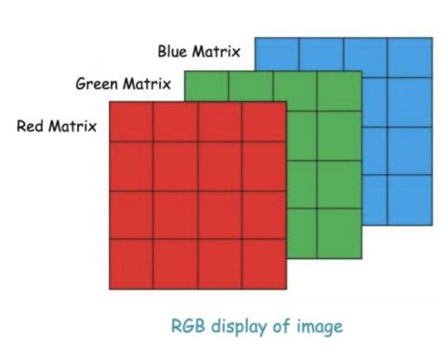 - In colour image, each pixel has three values for Red, Green, Blue and Represented as three stacked grids