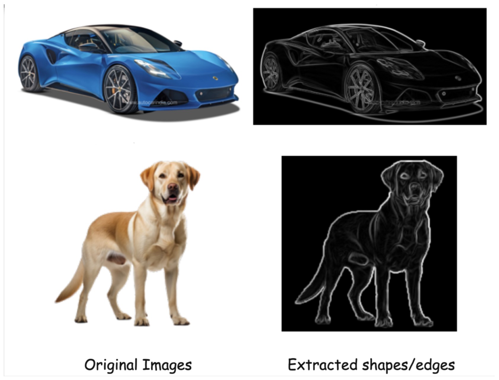 Machines need to extract features from these pixel values, so that it can identify images. The original images had a lot of information, like the shape of the object, its color, the edges, texture, may be background noise, etc. Models donβt need everything. Often, shape and edges are enough to distinguish objects. Edges highlight structure, hence in most of the cases, we can extract only the shape and the edges from the image.