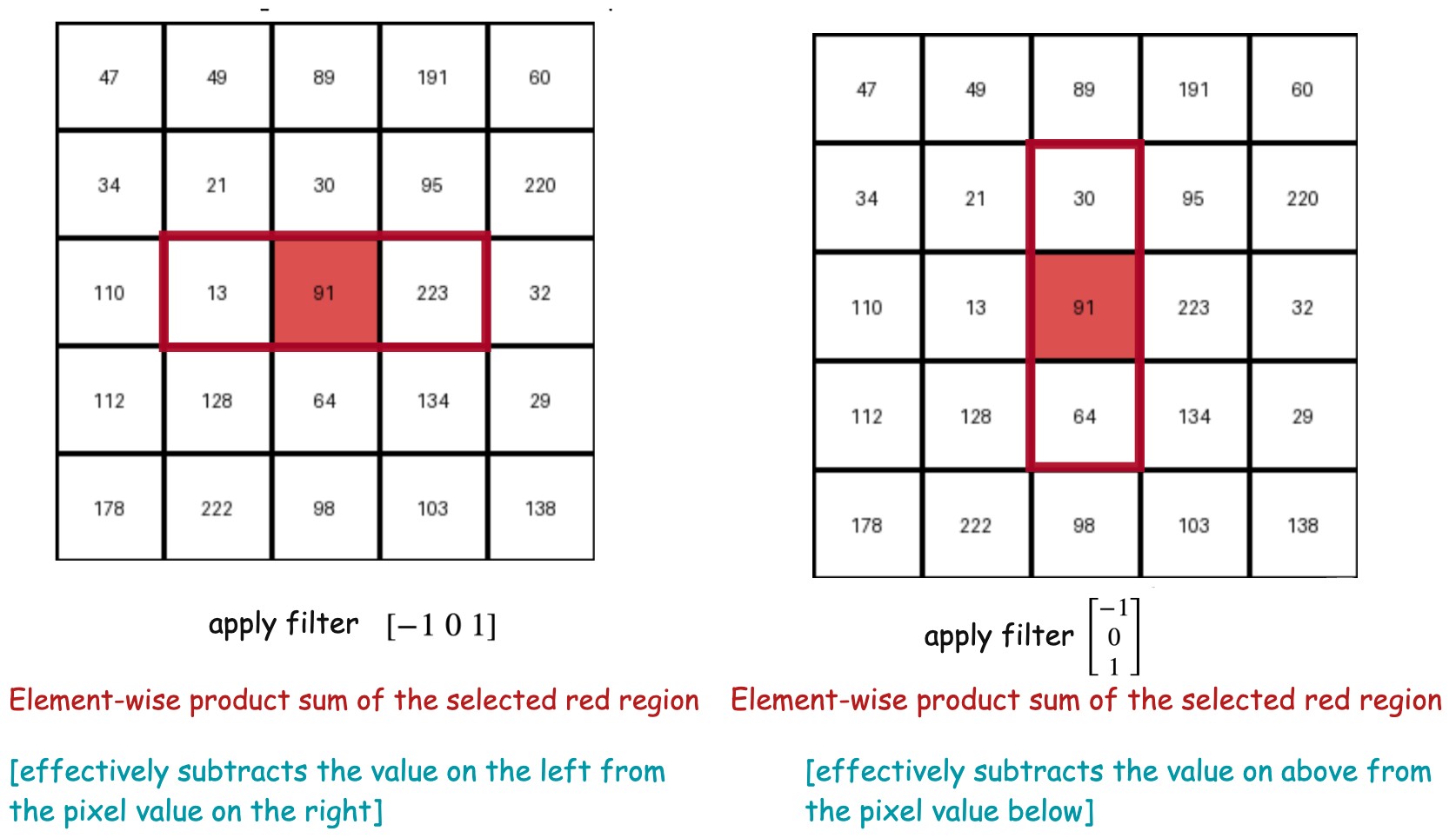 Now this can also be viewed as applying two filters in x and y direction. Applying a filter means selecting a region of the image around that specific pixel and take sum of element-wise product of the pixel values and the filter values.