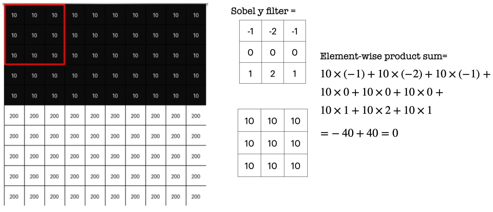 Now consider a 3x3 blocks of image where there is a horizontal edge -> means pixel intensities change drastically. Place the Sobel-y filter onto that block and calculate element-wise product sum. It will be a higher value.