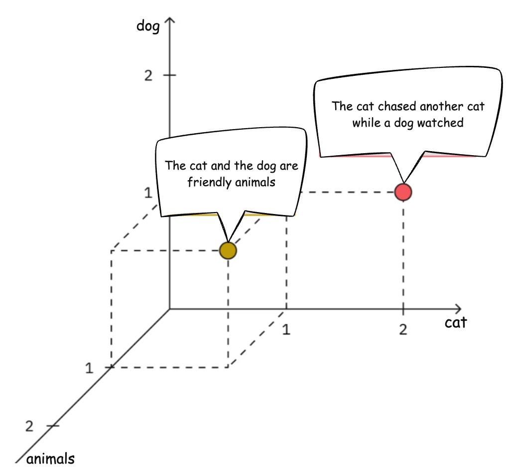 Assume the vocabulary (dimensions) contains only three words: cat, dog and animal