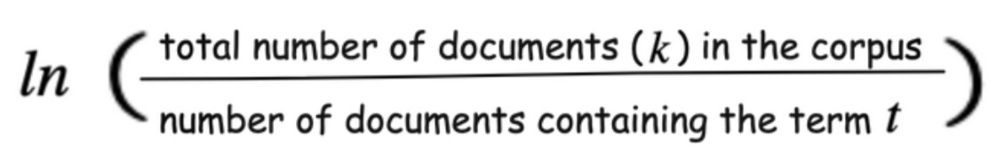 - Rarity across the corpus (IDF - Inverse document frequency)