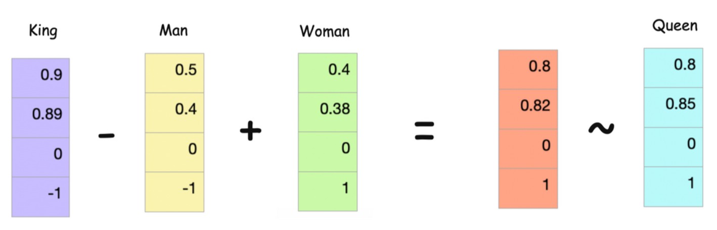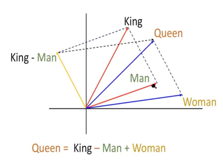 If we see the vectors here in the 2D space above, βManβ and βWomanβ are close and similar to each other. Similarly, king and queen are close to each other. If we add βKing - Manβ and βWomanβ we should get a vector close to βQueenβ.