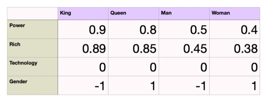 Consider a simple such vector representations here, We are considering the attributes power, rich, technology, gender in a 4-dimensional space.
