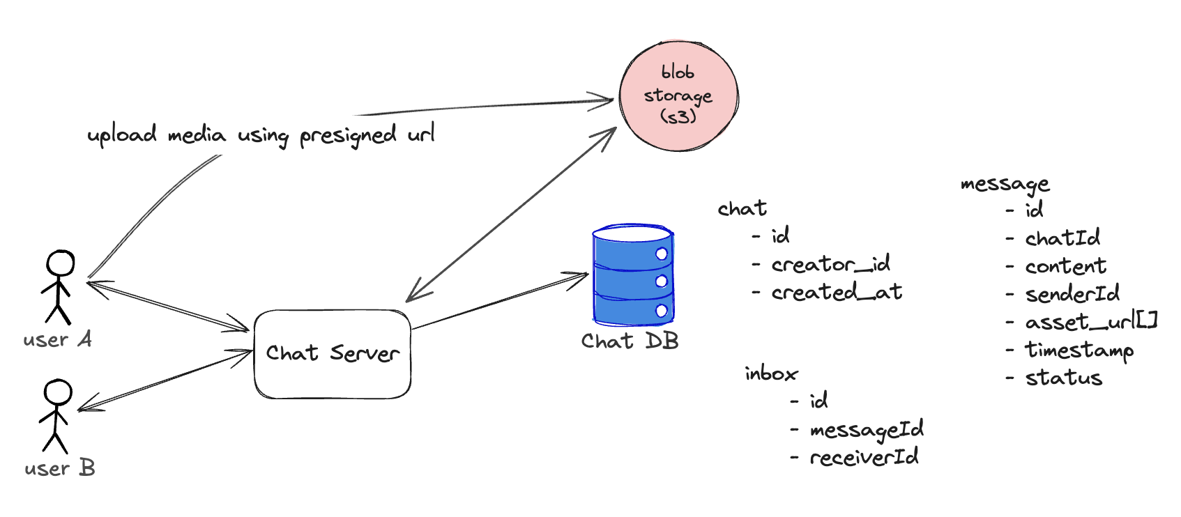 id— message identifiersenderUserId— reference toUserchatId— reference toChatcontent— text bodyasset_url(s)— optional media attachmentstimestamp— when the message was sent