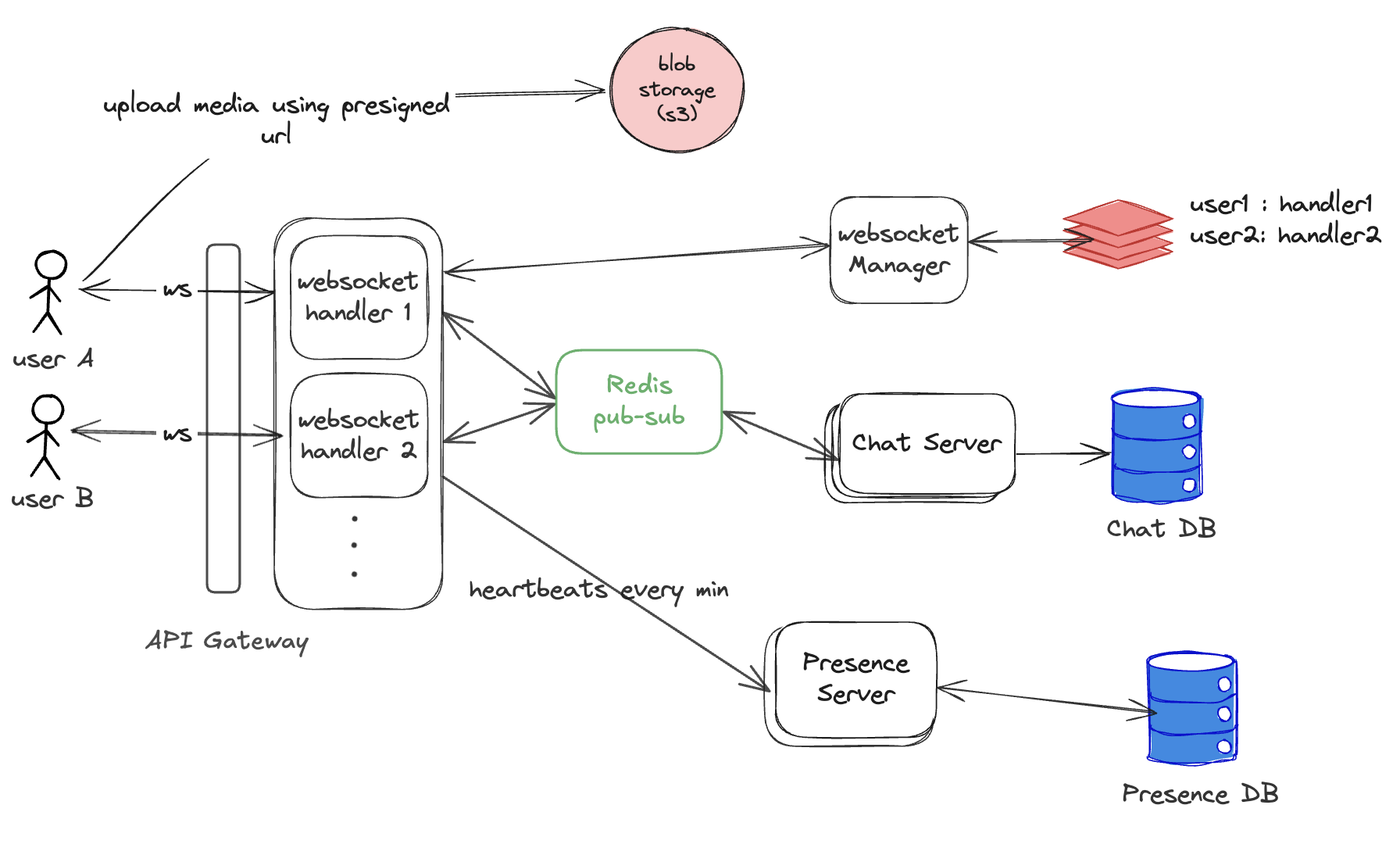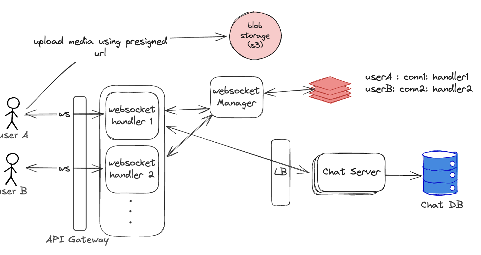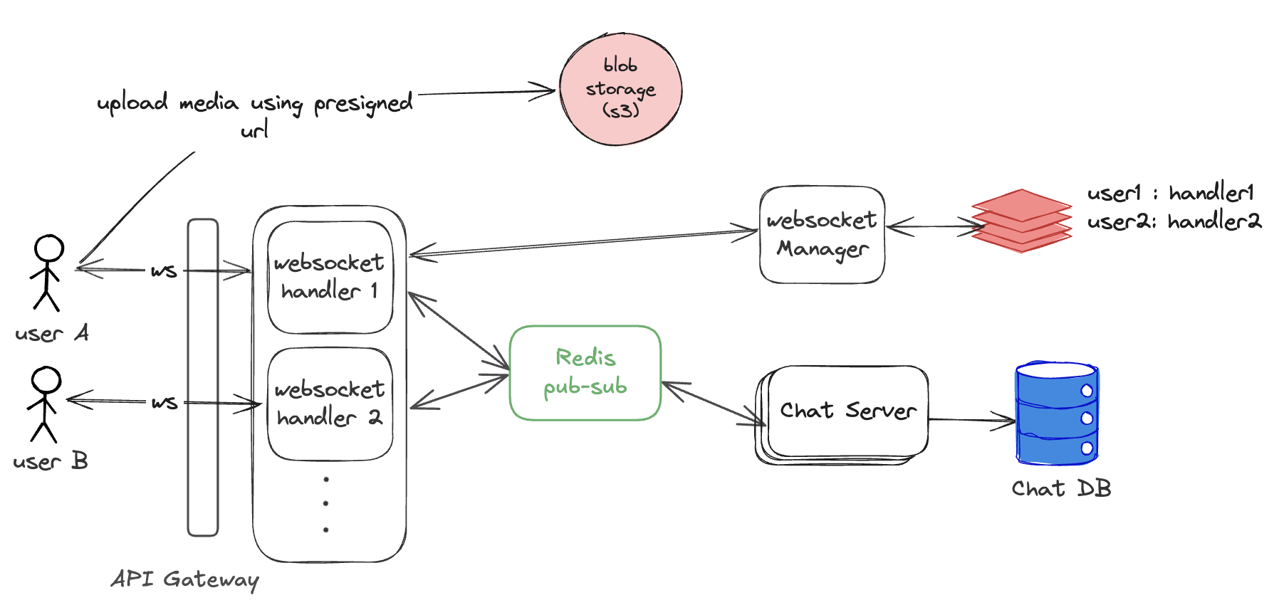 User A is connected to ws handler 1 User B is connected to ws handler 2